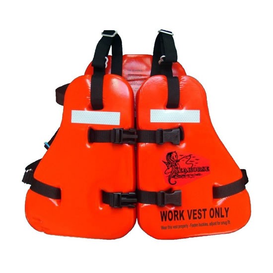 Seguridad: Para ayudar a compensar el equipo o ropa pesada que el usuario podría estar usando, la flotabilidad del chaleco Seahorse trabajo es mayor que el mínimo USCG. La correa para el pecho innovadora ayuda a mantener el chaleco en el usuario durante las caídas en el agua y evita que el chaleco se suba demasiado alto. A diferencia de otros tipos de hardware, las hebillas de liberación lateral de plástico no se salga accidentalmente deshecho o se convierten en un peligro para la pega.
