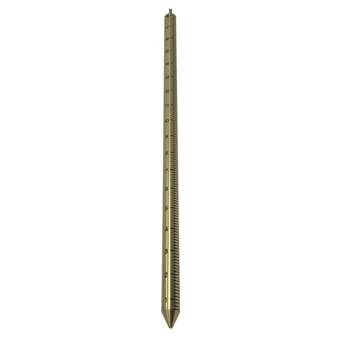 Hecho de latón. 18¾” de largo, ¾” de diámetro. Para uso en la medición de grandes tanques de almacenamiento con B.S pesado. & W. Escrito en pulgadas a octavos y dentado en toda la longitud del cuerpo para pasta indicadora de agua. Si se usa con una línea de calibre estándar para 42750 bob, agregue* 12 pulgadas a la medida. Consulte “Barras de medición de agua”; API/MPMS 3.1A, ASTM D1085. peso 2⅜ libras.